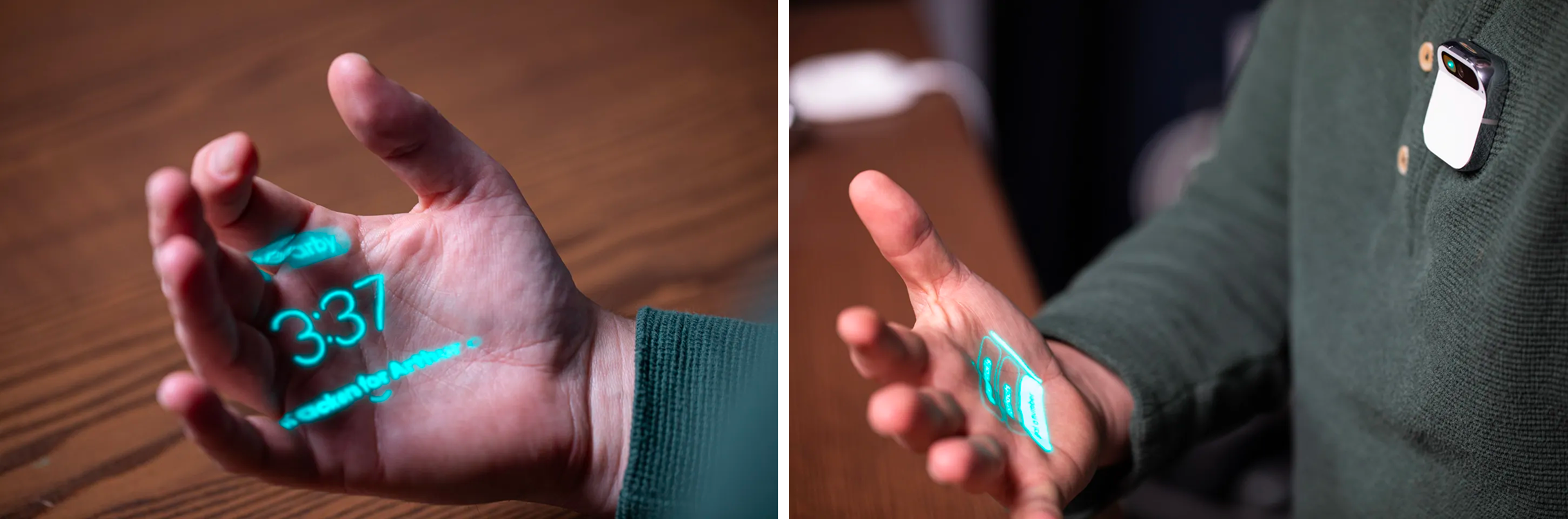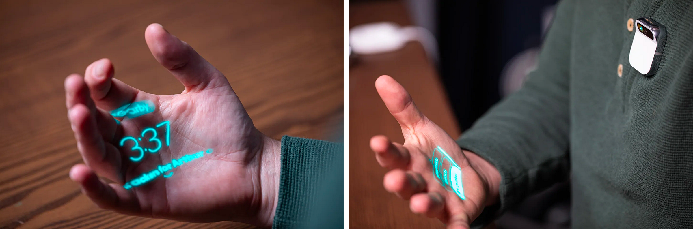 Visual scanning is just so much easier than listening when mentally mapping information to meaningful concepts. Thus, Humane included a small laser projector and depth-tracker in their device meant to display basic menus and texts and let you use your hand motion to control the interface. Very clever idea. If it works.
