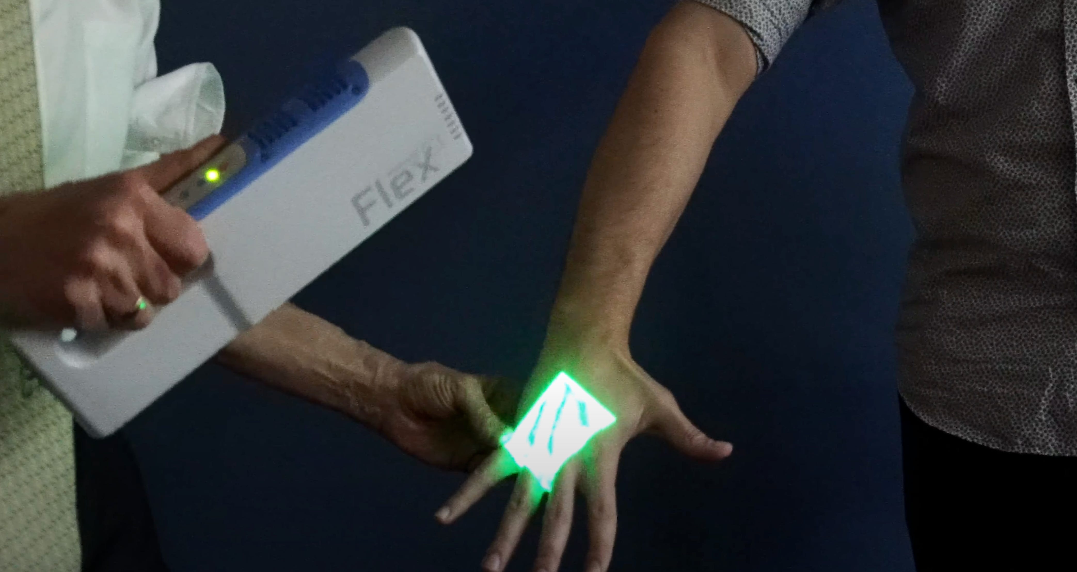 The medical device, the vein finder, is a good example of a clever mobile use case. A medical professional who needs help finding a vein can use the scanner to locate hidden veins underneath the patient’s skin. The device uses a deep infrared scanner to locate the vein and then shows the veins’ position using a green laser projector directly on the skin, again 1:1 mapping the digital to the physical. The body has become the substrate for interaction. This type of tech could be used in lots of medical scenarios; like mapping the fetal position of the baby onto a mother’s pregnant stomach, or aiding surgeons and staff to conduct complex procedures in the operating theatre, or just elucidate the hidden inner workings of the body to children visiting the doctor’s office. No touch controls, no screens, no heads-up displays. Just light.