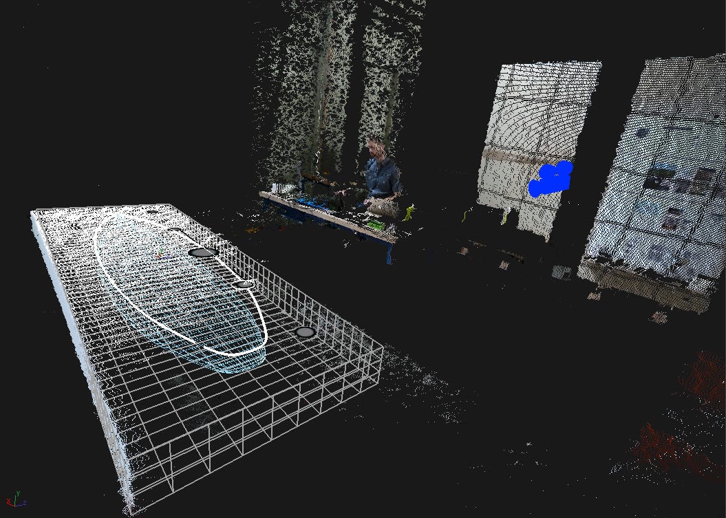 The demos showed object-tracking as an input-modality, both to find the user’s position and his gaze in 3D space and to analyze the current shape of the projected substrate and tool types. If the user were to alter the substrate, the computer would automatically compute the changes and re-render the visuals. In our example the surfboard shaper would shave off parts of the foam manually and then allow the computer to visualize stability zones, feet positions, or fluid dynamics right on the foam core. No need to leave the workshop and open a complicated 3D virtual model inside a simulation tool. The world is already simulated.